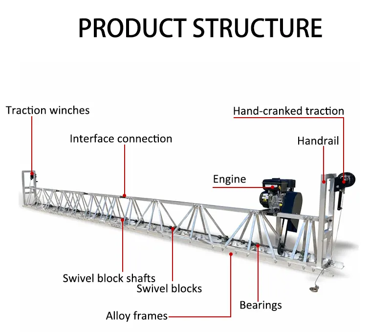 The 18M concrete floor Aluminum vibrating truss screed machine is an advanced construction equipment that integrates many advantages such as high efficiency, precision and durability. Its launch will greatly promote the technological progress and efficiency improvement of large concrete floor slab construction.