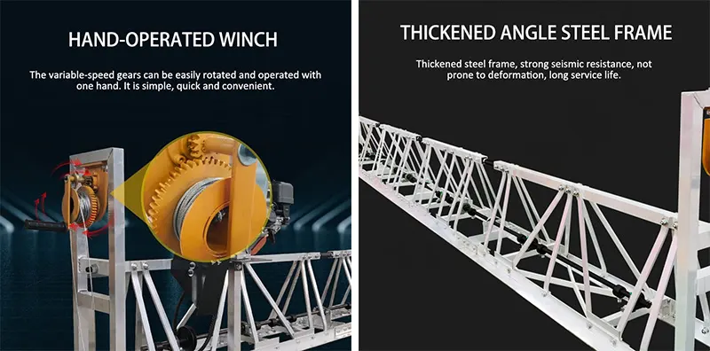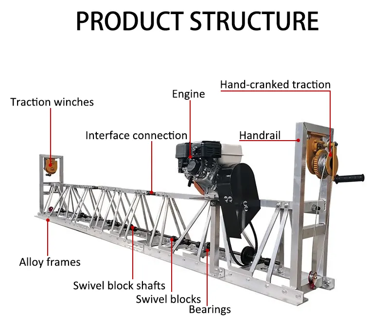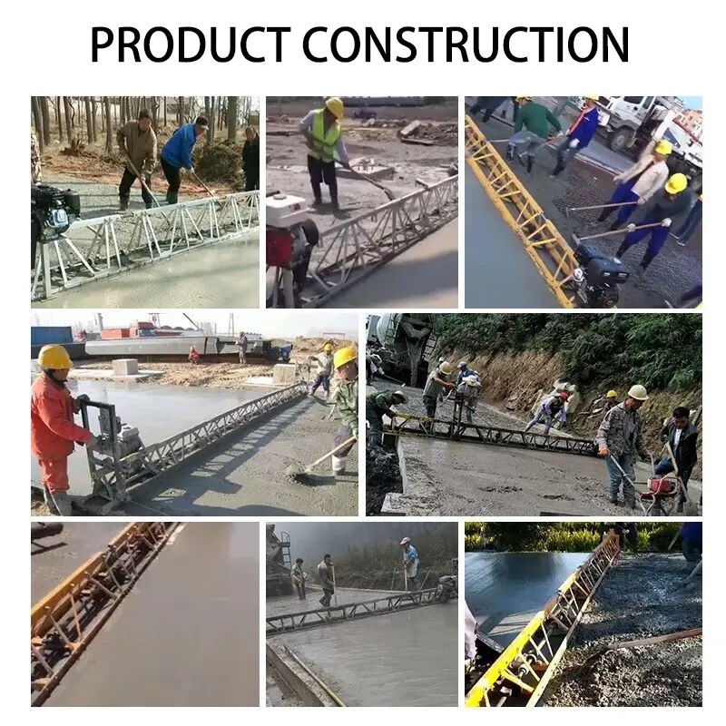 China manufacture 4m concrete floor aluminum vibrating truss screed machine leveling effect is good, the pavement width can be formed at one time within the range of 4-18 meters, which can reduce the longitudinal construction joint procedure. Because the running track is separated from the templated, the leveling work is not affected by the flatness of the base layer, which can ensure the smoothness of the road surface, and the concrete surface after molding has no honeycomb grinding surface, peeling cracks and exposed stone, and the quality is easy.