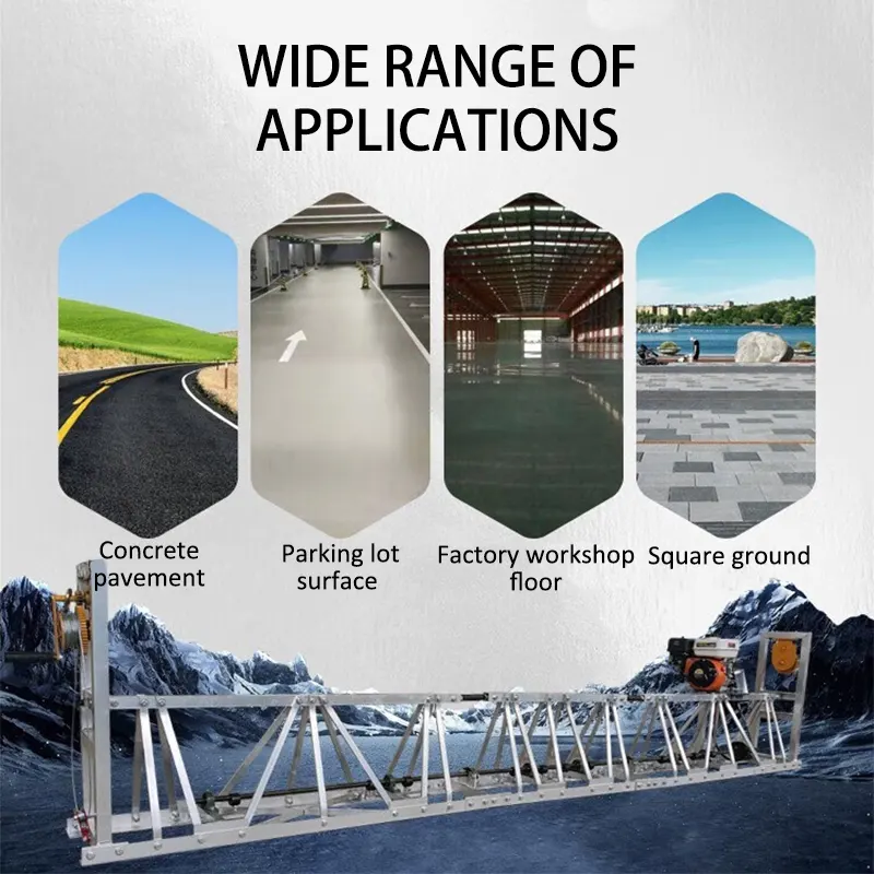 4M concrete floor Aluminum vibrating truss screed machine is mostly used to pave vibrating impact concrete surface, airport concrete surface, large packing slurry, plazas, railroads and other large of factory concrete surface. This is designed with exact paving system, suitable and perfect for large concrete surfaces, the max working width can be up to 16m or 18m.