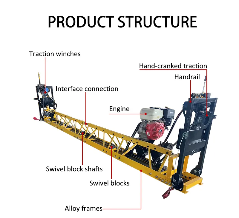 The 8m hydromatic automatic vibrating truss screed machine is equipped with a hand-cranked winch, which is convenient to control and speeds up the working process. The manual winch adopts alloy steel gears, which are labor-saving, durable, convenient and easy to operate.